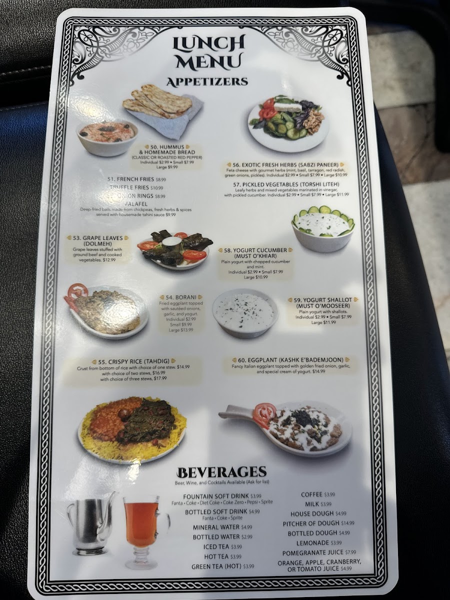 The restaurant's menu showcases an enticing variety of dishes such as mouthwatering kabobs and aromatic stews. Guests have praised favorites like the Sultani Kabob, which beautifully combines the flavors of beef koobideh and steak kabobs. Customer Y G noted the freshness and quality of the naan served with sabzi and borani, illustrating the restaurant's commitment to authentic Persian flavors.