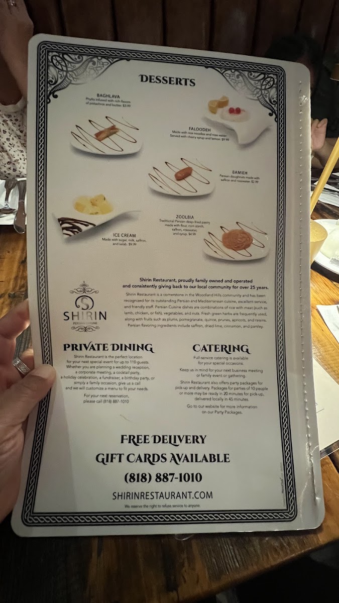 Located at 21826 Ventura Blvd, Woodland Hills, CA 91364, you can reach Shirin Restaurant at +1 818-887-1010. Whether you’re celebrating a special occasion or simply craving authentic Persian cuisine, Shirin invites you to savor the sweetness of their dishes and the heartwarming service that keeps customers returning.